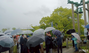 この雨の中、オランダから来訪の福岡俘虜収容所第14分所の元捕虜のご遺族•ご家族が31名、長崎の鐘を打鐘のため、平和公園に立ち寄られました。